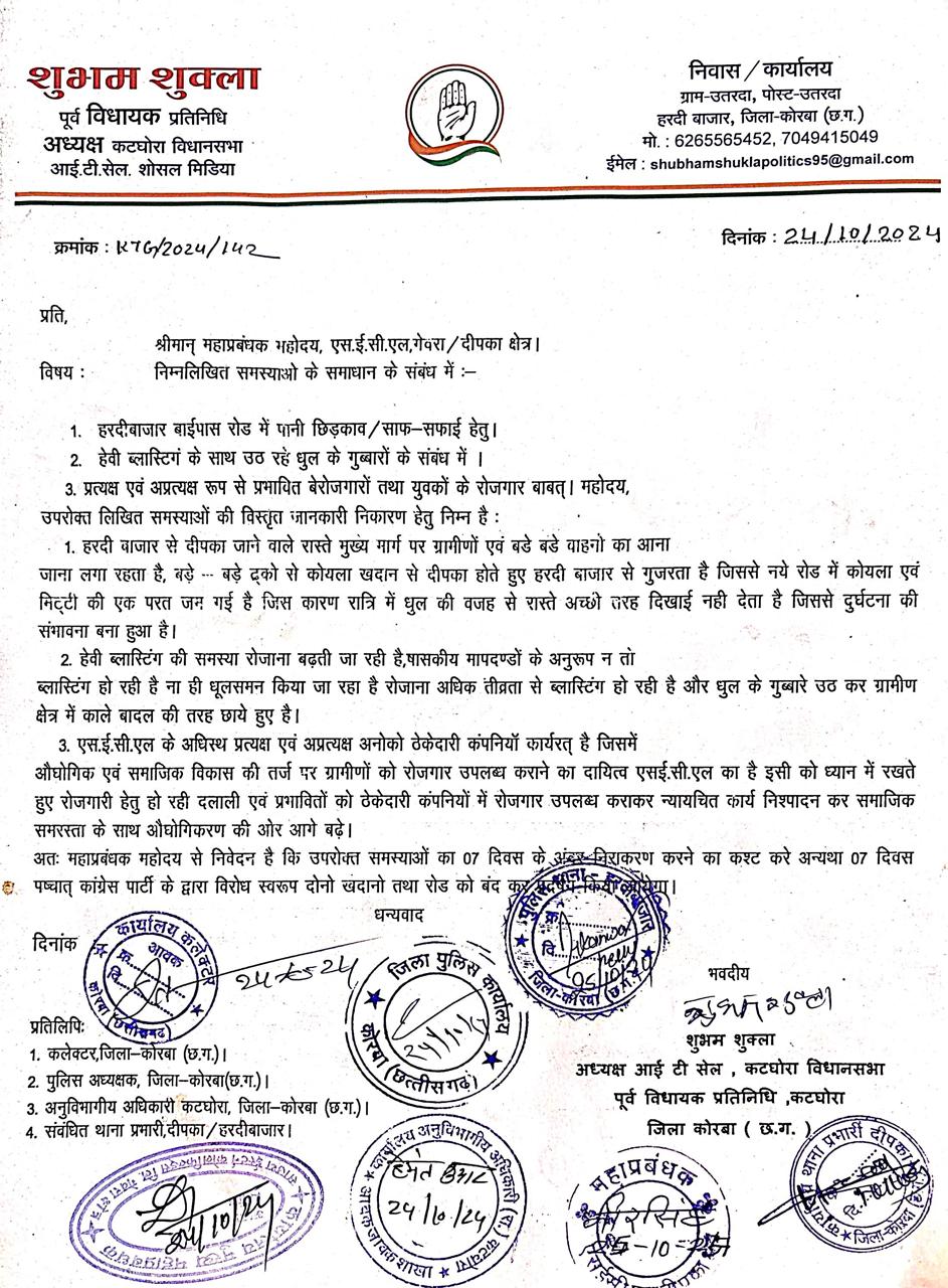 शुभम् शुक्ला द्वारा एसईसीएल पर आरोप लगाया कि एसईसीएल गेवरा दीपका खदान अभिशाप बनता चला ज रा है केवल दलली घोटाला बंदर बाट की नीति की तर्ज़ पर चल रहा है केवल जन कल्याण के नाम पर घोटाला एसईसीएल का जन कल्याण केवल पेपर और सरकारी बस्ते में है ।