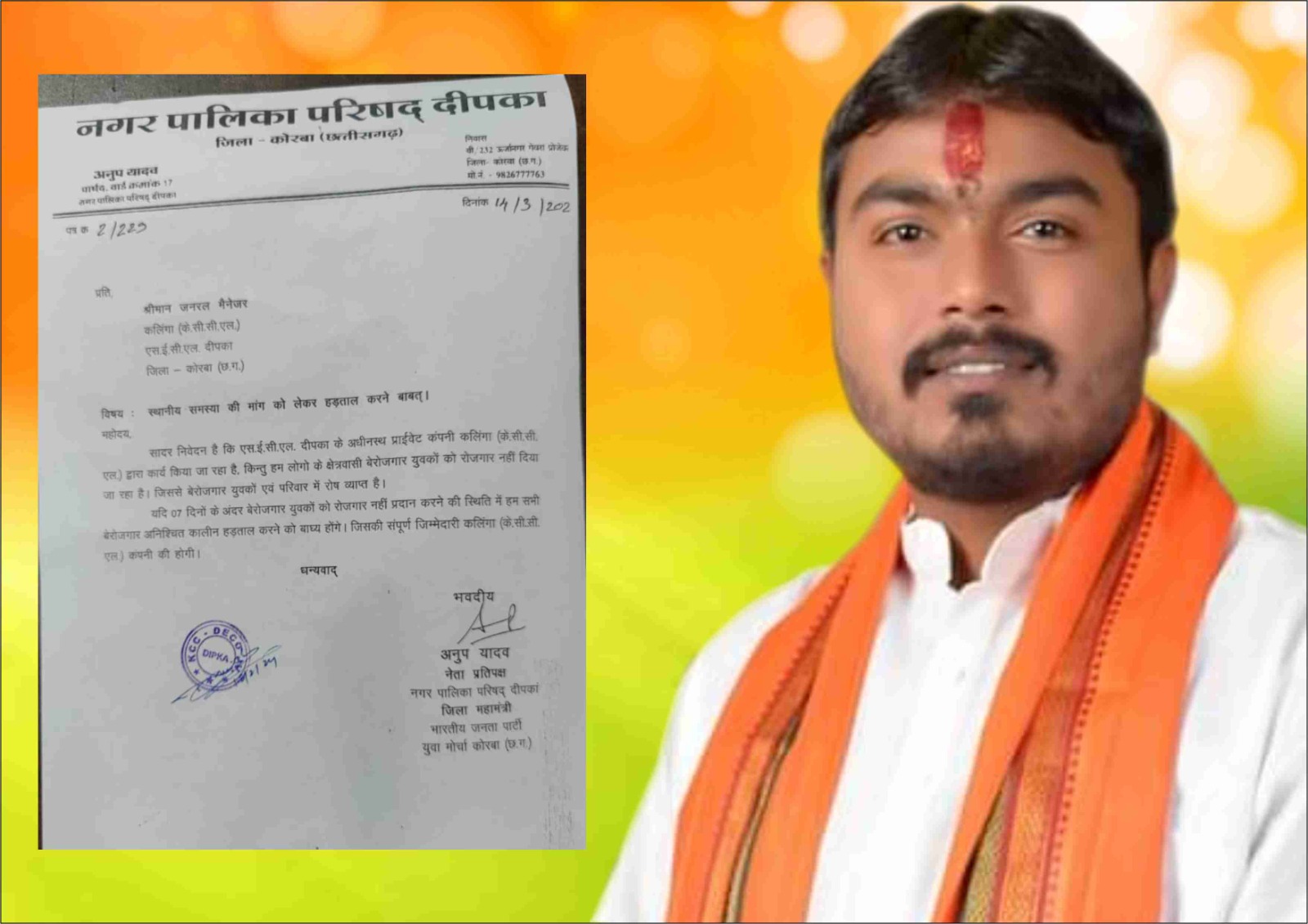 एसईसीएल के गेवरा एवं दीपका खदान में नियोजित आउटसोर्सिंग कंपनी कलिंगा में विभिन्न अनियमितताओं को लेकर नगर पालिका दीपका में नेता प्रतिपक्ष अनूप यादव ने कंपनी को पत्र लिखा है । अपने लिखे पत्र में उन्होंने लिखा की स्थानीय बेरोजगारों को लेकर जिस प्रकार की अनियमितताएं कंपनी में चल रही हैं उन्हें किसी रीति से बर्दाश्त नहीं किया जाएगा एवं अगर आगामी सात दिनों में कंपनी के रुख में बदलाव नहीं आता है तो सभी बेरोजगारों को लेकर कंपनी में अनिश्चितकालीन हड़ताल किया जाएगा ।