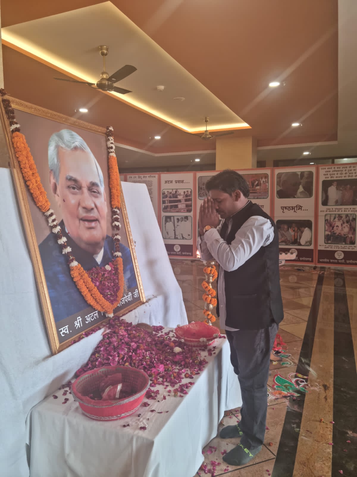 छत्तीसगढ़ भारतीय जनता पार्टी प्रदेश कार्यालय कुशाभाऊ ठाकरे परिसर में भारतीय जनता पार्टी के राष्ट्रीय उपाध्यक्ष पूर्व मुख्यमंत्री डॉ रमन सिंह भाजपा प्रदेश अध्यक्ष विष्णु देव साय संगठन महामंत्री पवन साय नेता प्रतिपक्ष धरमलाल कौशिक पूर्व कैबिनेट मंत्री बृजमोहन अग्रवाल राजेश मूणत अजय चंद्राकर की उपस्थिति में श्रद्धेय पूर्व प्रधानमंत्री भारत रत्न अटल बिहारी वाजपेयी जी के जयंती के अवसर पर पुष्पांजलि, संगोष्ठी, दीपकमल, पुस्तक का विमोचन किया गया साथ ही भारतीय जनता पार्टी प्रदेश के विभिन्न जिलों से तथा मोर्चा प्रकोष्ठ के मीडिया कवरेज के लिए बैठक आयोजित की गई इस अवसर पर कोरबा जिला से जिला महामंत्री भाजपा पिछड़ा वर्ग मोर्चा दीपक जायसवाल मीडिया कवरेज के लिए आयोजित बैठक में सम्मिलित हुए तथा भारत रत्न पूर्व प्रधानमंत्री अटल बिहारी वाजपेयी के जयंती के अवसर पर पुष्पांजलि अर्पित कर उन्हें नमन किया साथ ही भारतीय जनता पार्टी प्रदेश नेतृत्व के आव्हान पर अजातशत्रु श्रद्धेय अटल बिहारी वाजपेयी की जयंती पर उनकी स्मृति में दीपकमल अटल स्मृति पुस्तक के विमोचन कार्यक्रम में सम्मिलित हुए तथा श्रद्धा सुमन नमन किया।