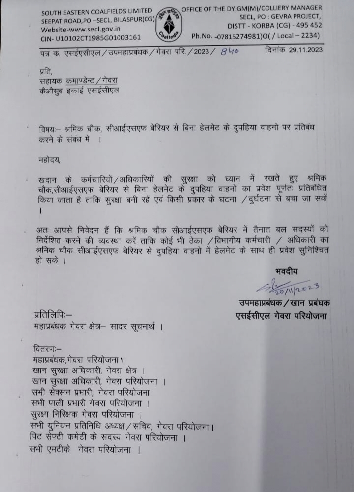 प्राप्त जानकारी के अनुसार दिनांक 29/11/2023 को कालरी मैनेजर द्वारा सहायक कमांडेंट – CISF गेवरा को पत्र प्रेषित किया गया है जिसमें कर्मचारी/अधिकारी /प्राईवेट कर्मचारी को बिना हेल्मेट CISF बेरियर से जाने पर प्रतिबंध लगाया जा रहा है। जानकारी लेने पर श्रमिक संगठन के पदाधिकारियों का कहना है कि प्रबंधन बिना हमारी जानकारी के ऐसा पत्र निकाला गया हमें प्रबंधन को यूनियन से सलाह-मशवरे के बाद ऐसा कानून जारी करना था खदान के अन्दर की सुरक्षा का प्रबंधन को कोई मशीनों में ध्यान नही है अला लग रही है। कर्मचारी की सुरक्षा का ध्यान नही । डंपिंग में वर्म नहीं है डंपर पलट जा रहा है मैं रोड रूल के हिसाव से सकरा है। मशीनो आयल लीकेज है। अन्य बहुत सारी प्रबलम के बावजूद कर्मचारी काम करता है. CISF को मोहरा बनाकर कर्मचारियो को प्रताड़ित करने का तरीका है। गोर तलब बात यह है कि गोल आफिस जाने वाले या काम करने वाले भी हेलमेट लगाने हेतू बाध्य होंगे