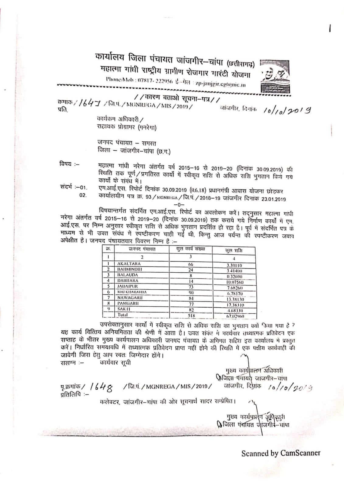 जांजगीर-चांपा/लोकल हलचल न्यूज: कार्यालय जिला पंचायत (छ.ग.) का पत्र क्र. / 1647 / जि.पं. / मनरेगा / एम. आई.एस. / 2019 जांजगीर दिनांक 10/10/2019 द्वारा जिले के जनपद पंचायतों में महात्मा गांधी नरेगा योजनान्तर्गत निजी शौचालय निर्माण कार्य स्वीकृत किये गये थे। वर्ष 2015-16 से 2019-20 ( सितम्बर 2019 ) की स्थिति तक पूर्ण / प्रगतिरत कार्यों में स्वीकृत राशि से अधिक का राशि का भुगतान के संबंध में जिले के सभी जनपद पंचायतों में संदर्भित पत्र के साथ कार्यों की सूची (संलग्न) जांच हेतु प्रदान किया गया था।