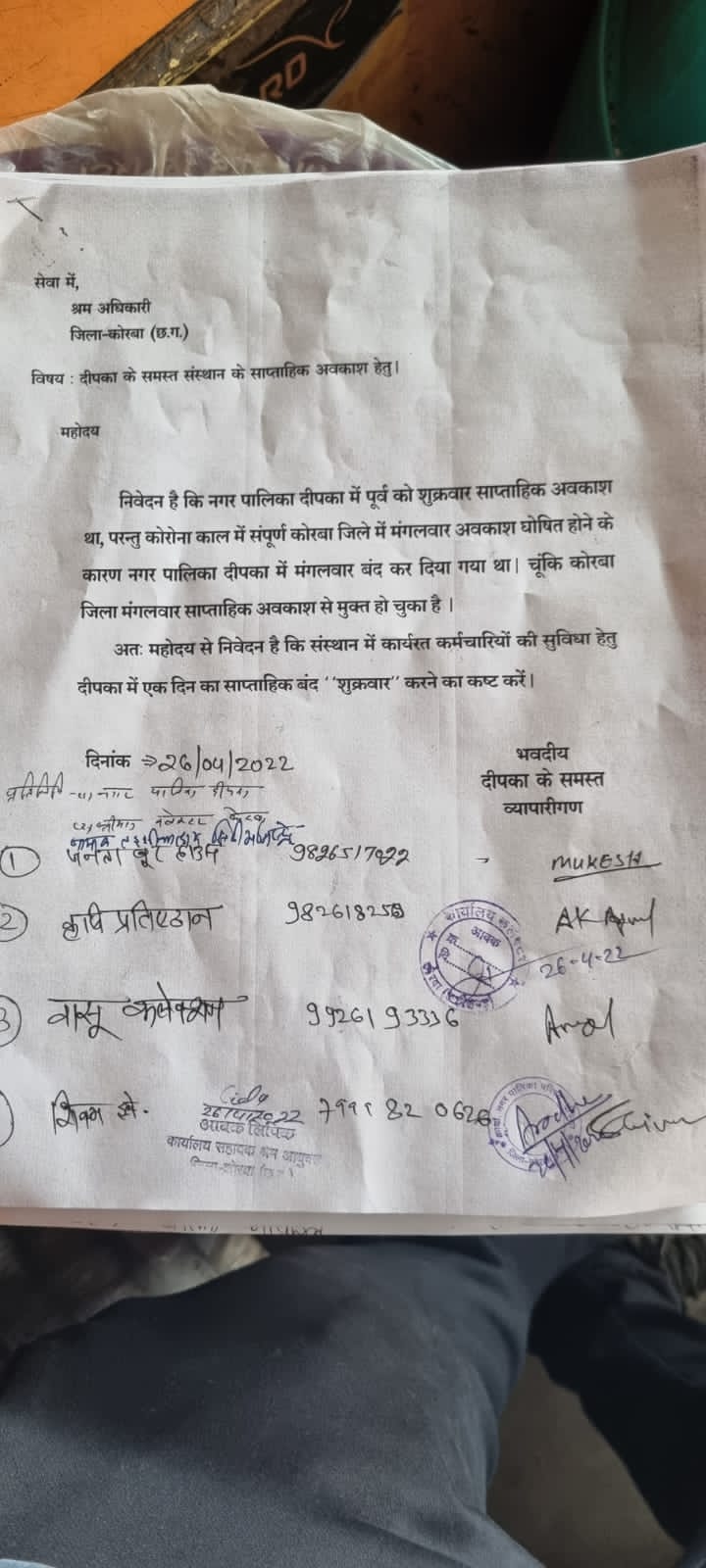 इसी बीच दीपिका के व्यापारीगणों ने श्रम विभाग को ज्ञापन सौंपा था जिसे श्रम विभाग ने मंजूरी दे दी है . नगरपालिका परिषद दीपका द्वारा एलाउंस कर नगरवासियों को इसकी जानकारी प्रदान करा रही है