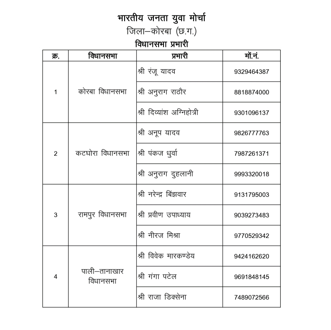 आगामी लोकसभा चुनाव की दृष्टि से भारतीय जनता पार्टी पूरी एक्शन मोड में नजर आ रही है इसी दृष्टि से पार्टी ने युवा मोर्चा की तरफ से विधानसभा प्रभारी की नियुक्ति की है