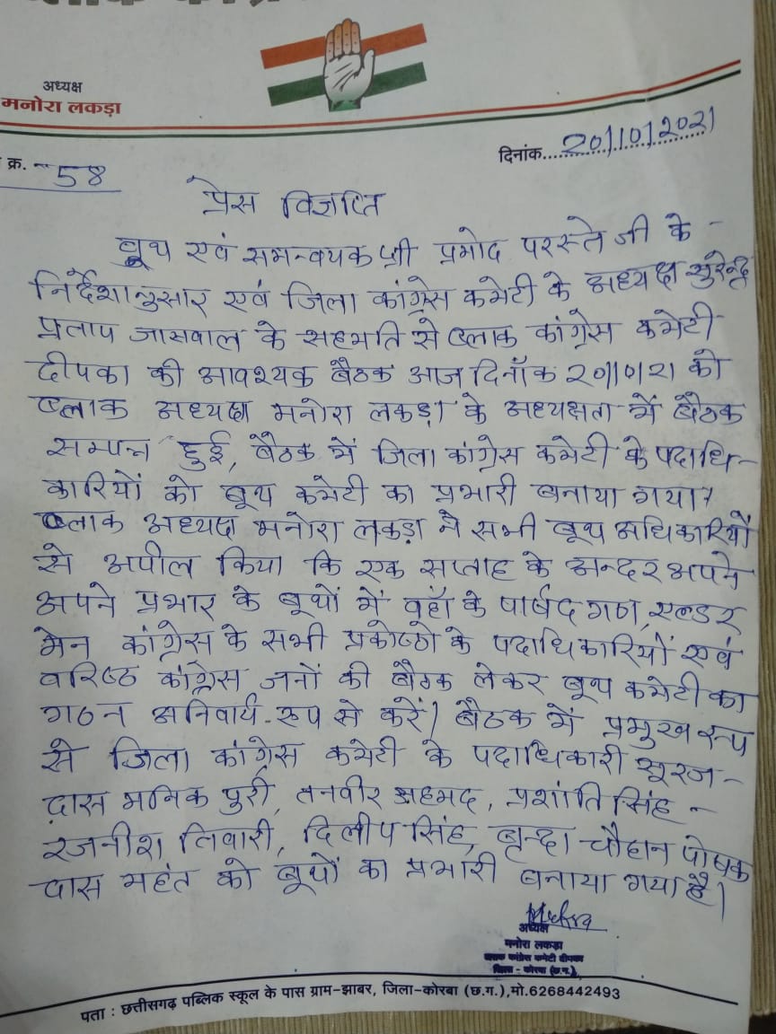 बूथ एवं समन्वयक प्रभारी श्री प्रमोद परस्ते जीके निर्देश अनुसार एवं जिला कांग्रेस कमेटी के अध्यक्ष श्री सुरेंद्र प्रताप जयसवाल जी के सहमति से ब्लॉक कांग्रेस कमेटी दीपिका की आवश्यक बैठक आज दिनांक 20.10.21 ब्लॉक अध्यक्षा दीपका श्रीमती मनोरा लकरा के अध्यक्षता में बैठक संपन्न हुई बैठक में जिला कांग्रेस कमेटी के पदाधिकारियों को बूथ कमेटी का प्रभारी बनाया गया ब्लॉक अध्यक्ष मनोरा लाकड़ा ने सभी बूथ अधिकारियों से अपील किया है कि 1 सप्ताह के अंदर अपने अपने प्रभार के बूथों में वहां के पार्षदों एवं एल्डरमैन कांग्रेस के सभी प्रकोष्ठ के पदाधिकारियों एवं वरिष्ठ कांग्रेसियों जनों की बैठक लेकर बूथ कमेटी का गठन अनिवार्य रूप से करें बैठक में प्रमुख रूप से जिला कांग्रेस कमेटी के पदाधिकारी सूरज दास मानिकपुरी तनवीर अहमद, प्रशांति सिंह, रजनीश तिवारी, दिलीप सिंह वृंदा चौहान ,एवं पोषक दास महंत सांसद प्रतिनिधि बूथों का प्रभारी बनाया गया