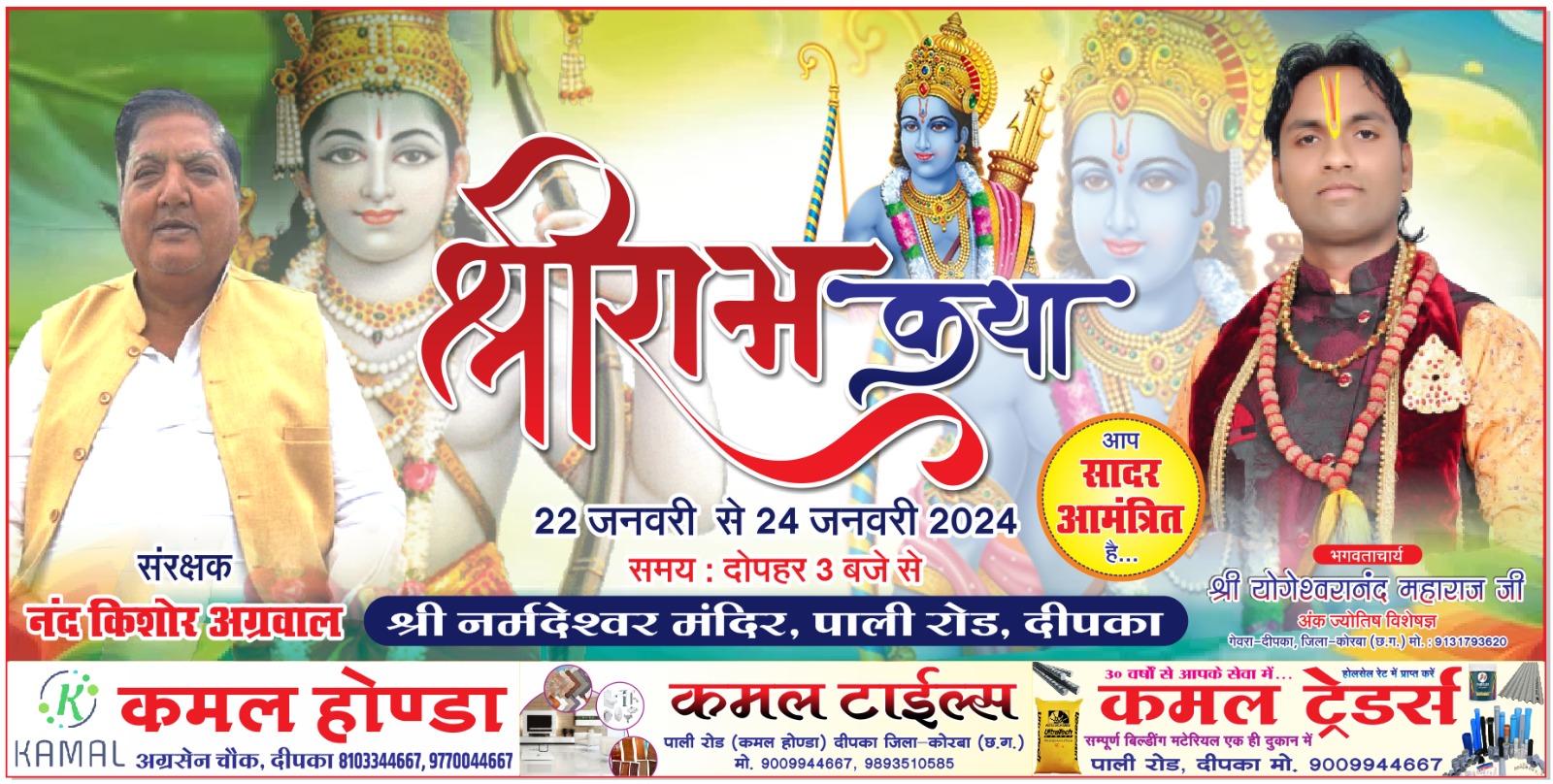 Home Uncategorized दीपका श्री नर्मदेश्वर मंदिर में श्री राम कथा 22 जनवरी से 24... Uncategorized दीपका श्री नर्मदेश्वर मंदिर में श्री राम कथा 22 जनवरी से 24 जनवरी By Anurag Rathore - January 16, 2024 989 0 FacebookTwitterPinterestWhatsApp