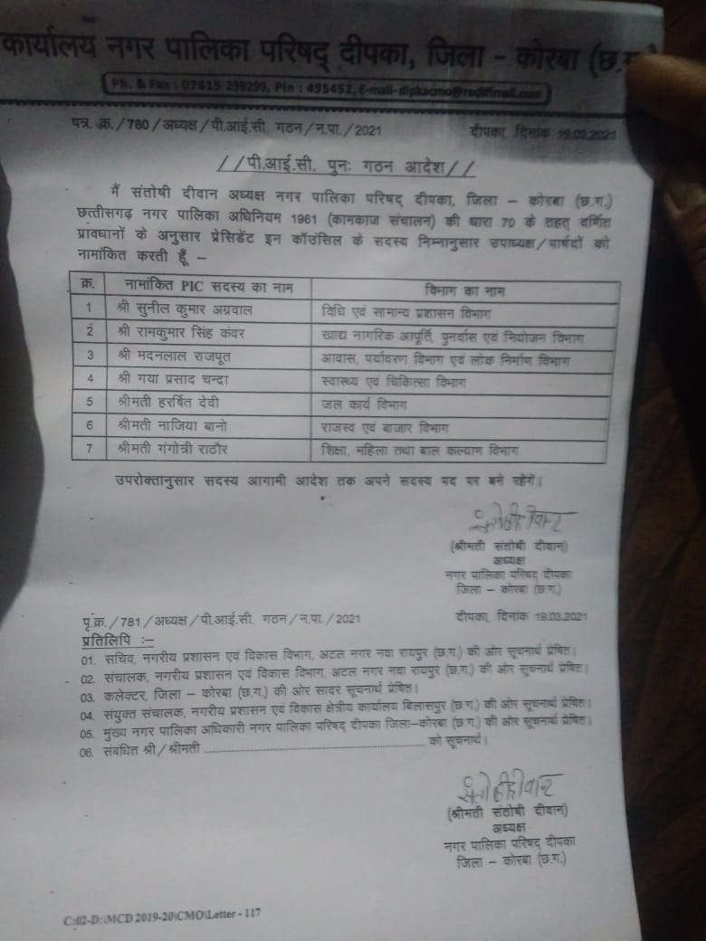 Home Politics दीपिका नगर पालिका में हुआ पी आई सी का नया गठन PoliticsState दीपिका नगर पालिका में हुआ पी आई सी का नया गठन By Anurag Rathore - March 22, 2021 837 0 FacebookTwitterPinterestWhatsApp नगर पालिका अध्यक्ष श्रीमती संतोषी दीवान ने गठित की नई पीआईसी । काँग्रेस को समर्थन देने वाली निर्दलीय पार्षद श्रीमती निशा बंजारे को दिखाया बाहर का रास्ता । भाजपा पार्षद श्रीमती गंगोत्री राठौर काँग्रेस सरकार में नई पीआईसी सदस्य होंगी ।