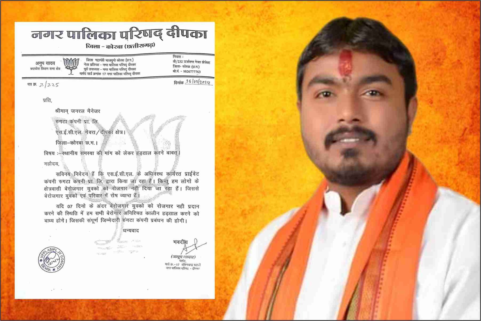 नगर पालिका परिषद दीपका के नेता प्रतिपक्ष अनूप यादव ने स्थानी समस्याओं एवं युवा बेरोजगारों को नौकरी देने हेतू रुंगटा कंपनी गेवरा को ज्ञापन दिया