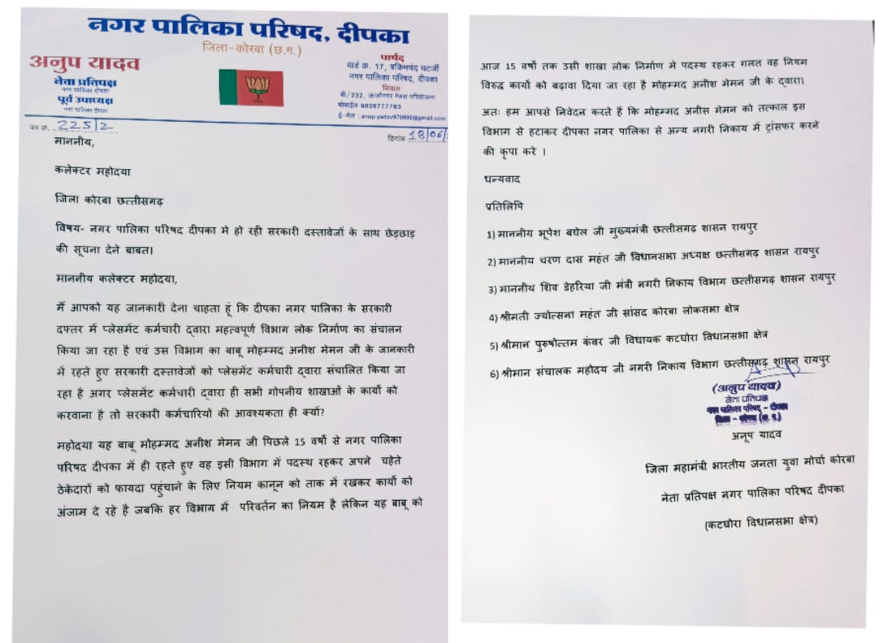 नगर पालिका परिषद दीपका नेता प्रतिपक्ष अनूप यादव ने की मुख्यमंत्री से नगर पालिका लोक निर्माण विभाग के अधिकारी मोहम्मद अनीस मेमन की शिकायत