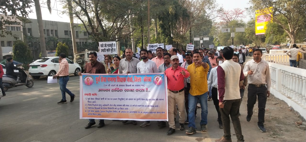 कोरबा/ पूर्व सेवा गणना शिक्षक मोर्चा के प्रांतीय आह्वान पर ज़िला मुख्यालय कोरबा में एक दिवसीय धरना दिया गया। धरने में ज़िले के सैकड़ों शिक्षक शामिल हुए। शाम को 3 बजे रैली निकालकर कलेक्ट्रेट पहुंचे और मुख्यमंत्री, शिक्षामंत्री, मुख्य सचिव के नाम ज्ञापन कलेक्टर को सौंपा गया। धरना स्थल तानसेन चौक में 10 बजे से ही ज़िले भर के शिक्षक एकत्र होने लगे। प्रांतीय उपसंयोजक ओमप्रकाश बघेल, प्रमोद राजपूत,रामचरण साहू, भावदीप दुबे, जिला सह संयोजक चंद्रिका प्रसाद पाण्डेय, रामनाथ बघेल, नरेंद्र चंद्रा, बल्लभ दास वैष्णव,लीला बिहारी कौशिक ,अशोक कश्यप ने शिक्षकों को संबोधित किया। ज़िला संचालक नित्यानन्द यादव,वेदव्रत शर्मा एवम मनोज चौबे ने संयुक्त रूप से सभा को सम्बोधित करते हुए कहा कि पुरानी पेंशन हमारे बुढ़ापे का सहारा है। सरकार हमे 2018 से पुरानी पेंशन देकर हमारे साथ छलावा कर रही है। सरकार को हमारी मांगे माननी पड़ेगी। हम नियुक्ति तिथि से पुरानी पेंशन लेकर रहेंगे। इसके लिए हमे संगठित होकर आंदोलन करना होगा। प्रांतीय उप संयोजक ओमप्रकाश ने संबोधित करते हुए कहा कि हमारी नियुक्ति 1998 में हुई और 2012 से नवीन पेंशन योजना हमारे लिए लागू की गई। अब सरकार हमे पुरानी पेंशन दे रही है तो नियुक्ति तिथि से इसका लाभ प्रदान किया जाए। अगर नियुक्ति तिथि से पुरानी पेंशन का लाभ नही मिलता तो हम लोग मजबूर होकर आंदोलन की राह पकड़ेंगे।