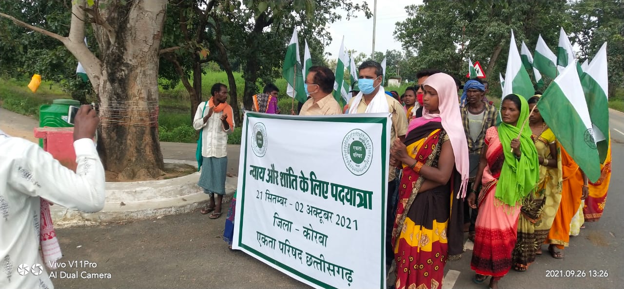 कोरबा – एकता परिषद छत्तीसगढ़ द्वारा न्याय और शांति के लिए पूरे छत्तीसगढ़ राज्य में पदयात्रा का कार्यक्रम आयोजित किया जा रहा है जिसमे कोरबा जिले के पदयात्रा कोरबा लोकसभा क्षेत्र के सांसद प्रतिनिधि पोशक दास महंत एवं वरिष्ठ कांग्रेस नेता पी आई सी सदस्य गया प्रसाद चंद्रा द्वारा कोरबा जिले के सबसे अंतिम छोर के दूरस्थ आदिवासी ग्राम पसान मे कोरबा लोकसभा क्षेत्र के पदयात्रा को झंडा दिखाकर शुभारंभ किया गया ज्ञात हो कि एकता परिषद दूरस्थ आदिवासी अंचल के पंडों जातियों के उत्थान एवं विकास के लिए गठन किया गया है कांग्रेस पार्टी इन के विकास के लिए संकल्पित है