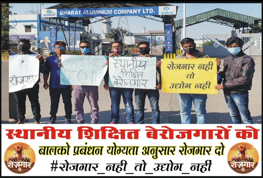 बालको स्थानीय शिक्षित बेरोजगारों द्वारा वेदांता अधिकृत भारत एल्युमिनियम कंपनी में स्थानीय युवाओं को रोजगार से वंचित करने के विरोध में क्रमिक अनशन में 20 अगस्त 2021 से बालको परसाभाटा गेट के सामने बैठने जा रहे है