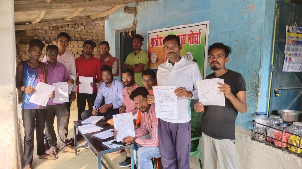 भारतीय जनता युवा मोर्चा के प्रदेश नेतृत्व के निर्देशानुसार प्रदेश में लगातार बढ़ते बेरोजगारी के खिलाफ बेरोजगार युवाओं को उनका हक दिलाने के लिए युवा मोर्चा प्रदेश के सभी शक्तिकेन्द्रों में युवा चौपाल लगाकर, घर-घर तक जाकर युवाओं की समस्या जानेंगे और बेरोजगार युवाओं का फॉर्म भरवाएंगे। इसी कड़ी में चैतमा मंडल के बनबाँधा शक्तिकेन्द्र के माखनपुर में युवा चौपाल लगाकर युवाओं की समस्याएं सुनी गई और उनका फॉर्म भरवाया गया। इस अवसर पर भाजपा अनुसूचित जनजाति मोर्चा के जिला मंत्री शिवप्रकाश कँवर, भाजयुमो जिला संयोजक सोशल मीडिया एवं चैतमा मंडल प्रभारी विभूति कश्यप, भाजयुमो मंडल अध्यक्ष विजय श्याम, भाजयुमो मंडल महामंत्री मिथुन कुमार यादव एवं बृजेश यादव,भाजयुमो मंडल उपाध्यक्ष कैलाश उइके, भाजयुमो मंडल उपाध्यक्ष संदीप प्रजापति, पिछडा वर्ग मोर्चा सोशल मीडिया संयोजक जोहित यादव, सूरज कैवर्त, अनिल कंवर, अमित कंवर, सचिन सिन्द्राम, शनि आरमोर, सत्यनारायण टेकाम, संदीप टेकाम, विवेक कुमार, अभिषेक नेटी, ओम प्रकाश चौहान, प्रकाश कुमार सहित अन्य कार्यकर्ता उपस्थित रहें।