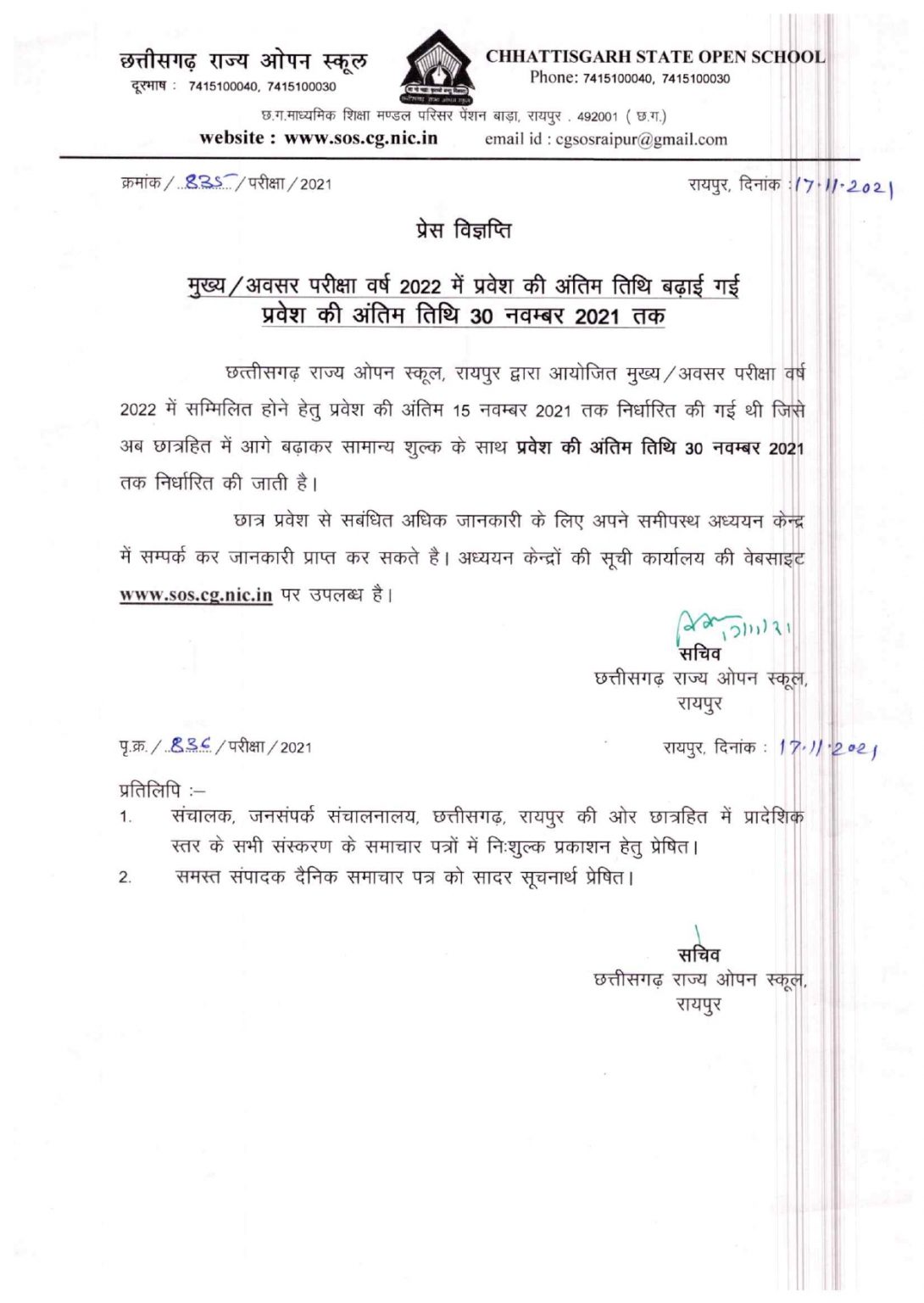 जारी विज्ञप्ति के अनुसार छत्तीसगढ़ राज्य ओपन स्कूल रायपुर द्वारा आयोजित मुख्य/अवसर परीक्षा 2022 में सम्मिलित होने हेतु प्रवेश की अंतिम तिथि 15 नवम्बर 2021 तक निर्धारित की गई थी । लेकिन छात्रहित को देखते हुए इसे आगे बढ़ाकर सामान्य शुल्क के साथ 30 नंवबर 2021 तक कर दी गई है।