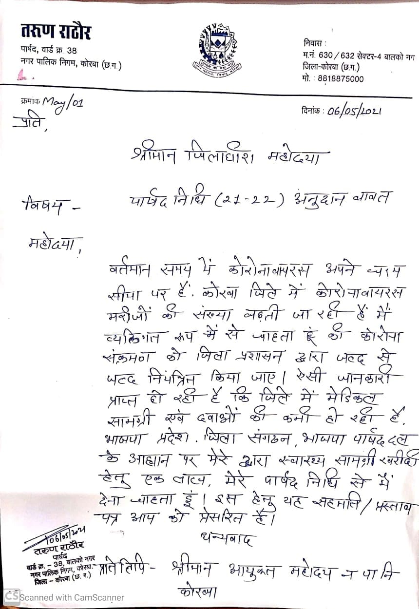 कोरोना वायरस के बढ़ते संक्रमण के कारण स्वास्थ्य सुविधाओं की पूर्ति हेतु मेडीकल सामग्री एवं दवाओं की खरीदी करने हेतु पार्षद श्री तरुण राठौर ने अपने वर्ष 2020 – 21 की पार्षद निधि से उक्त एक लाख रुपए की स्वीकृति संबंधी पत्र जिलाधीश कोरबा एवं निगम आयुक्त को पत्र सौंपा है