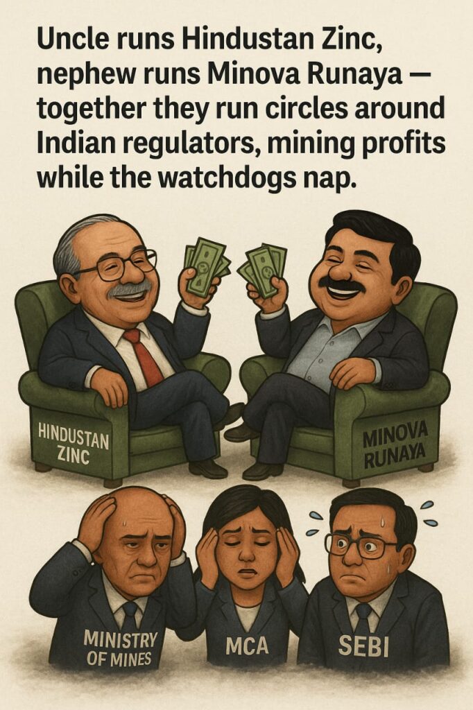 1. Anil Agarwal को लाभ: MCA दस्तावेजों के अनुसार, मार्च 2025 तक Runaya Metsource — जो Minova Runaya में 49% की हिस्सेदार है — 99% Twinstar Overseas के स्वामित्व में है, और इसका अंतिम लाभार्थी अनिल अग्रवाल हैं। इससे स्पष्ट होता है कि यह पूरा तंत्र लाभ को Vedanta के प्रमोटर समूह तक पहुँचाने के लिए तैयार किया गया था।