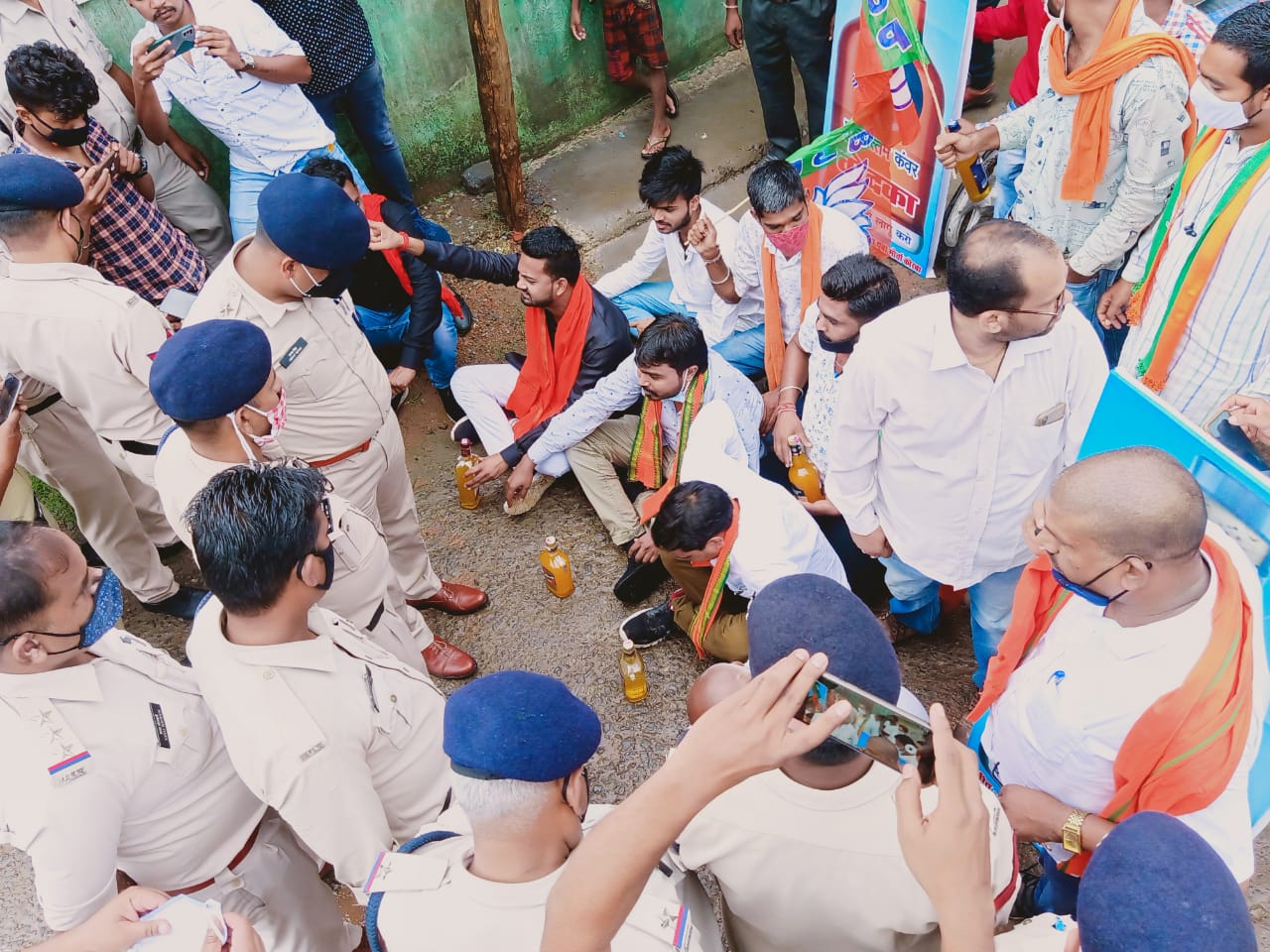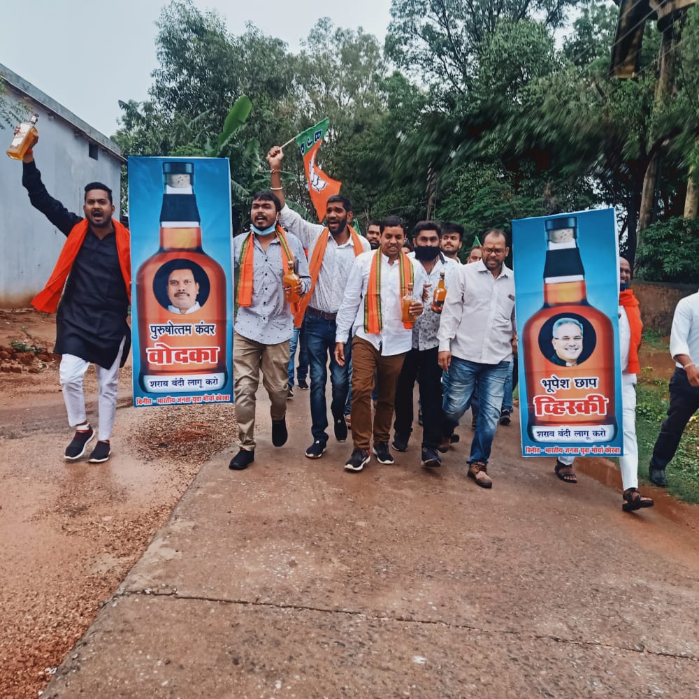 हरदी बाजार छत्तीसगढ़ सरकार भूपेश बघेल के वादाखिलाफी को लेकर हरदी बाजार मंडल भाजपा युवा मोर्चा तत्वधान में युवा कार्यकर्ताओं ने कॉलेज चौक मेन रोड से लेकर क्षेत्रीय कटघोरा विधायक पुरुषोत्तम कंवर के निवास तक नारा लगाते हुए चौक से नारा लगाते हुए रैली निकाली गई जिसमें विधायक निवास से 100 मीटर दूरी पर पुलिस प्रशासन की ओर से हरदी बाजार चौकी प्रभारी दीपका थाना प्रभारी एवं कुसमुंडा थाना प्रभारी सहित सदल बल के साथ भाजपाइयों को रोका गया इस दौरान कार्यकर्ताओं ने जमकर भूपेश सरकार के खिलाफ नारा लगाए साथ ही क्षेत्रीय विधायक को मुख्यमंत्री तक बात पहुंचाने के लिए शराब की बोतल लेकर वहां तक पहुंचे पुलिस प्रशासन एवं तहसीलदार के समक्ष शराब की बोतल खोल कर शराब को गिराया गया इस दौरान विधायक की ओर से हरदी बाजार तहसीलदार पी आर सलामे को भूपेश सरकार के खिलाफ भाजपाइयों ने ज्ञापन सौंपा और कहा गया कि यह संदेश विधायक जी के द्वारा मुख्यमंत्री तक पहुंचाया जाए इस दौरान उपस्थित श्याम लाल मरावी वरिष्ठ भाजपा नेता,नरेंद्र देवांगन जिला महामंत्री युवा मोर्चा,अनुप यादव जिला महामंत्री युवा मोर्चा,नरेश टंडन जिला मंत्री भाजपा,चुलेश्वर राठौर जिला अध्यक्ष किसान मोर्चा,हरीश थरवानी मंडल अध्यक्ष भाजपा हरदी बाजार,अभिनाश कंवर जिला अध्यक्ष अनुसूचित जनजाति मोर्चा,पंकज ध्रुवा युवा मोर्चा जिलाकार्य समिति सदस्य,अजय कंवर जिला महामंत्री अनुसूचित जनजाति मोर्चा,हीरा लाल यादव जिलाकार्य समिति सदस्य पिछड़ा वर्ग मोर्चा,सुजीत सिंह मंडल अध्यक्ष युवा मोर्चा दीपका,मन्नू राठौर मंडल मंत्री, बजरंग यादव भाजपा युवा नेता,कृष्णा पटेल युवा मोर्चा मंडल अध्यक्ष हरदी बाजार, नरेन्द्र अहीर यूवा नेता,रामेश्वर यादव,सौरभ गुरुद्वान मंडल महामंत्री दीपका,विकास सिन्हा,हितेश अग्रवाल,ऋषभ साहू , शुभम महतो सहित भाजपा कार्यकर्ता उपस्थित रहे