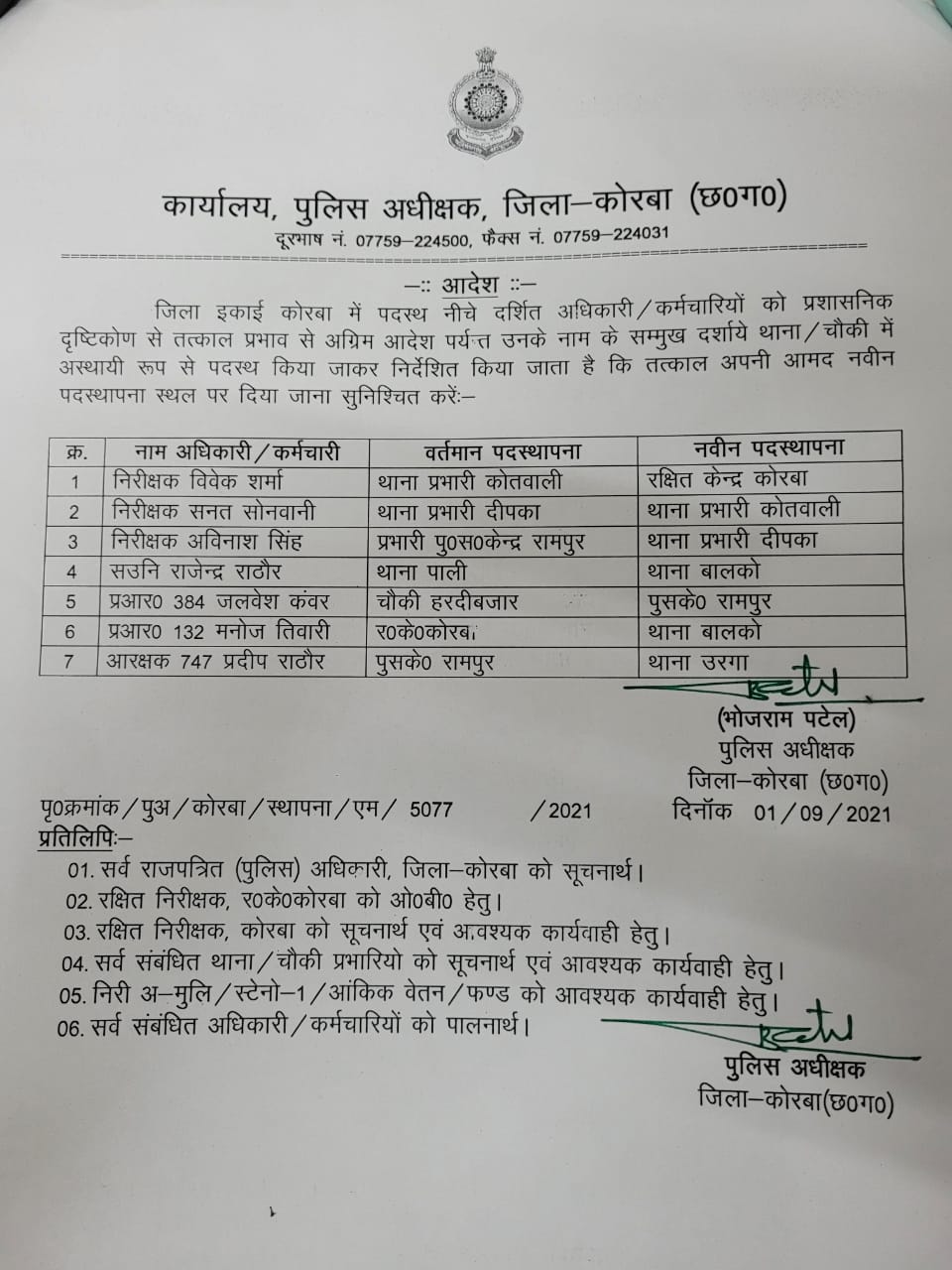 पुलिस कप्तान भोज राम पटेल ने विभागीय कार्यो में कसावट लाने के लिए बुधवार को स्थांतरण आदेश जारी किया है। जारी आदेश के मुताबकि 7 पुलिस अधिकारियों के प्रभार में फेरबदल करते हुए जिले के विभिन्न थाना चौकियों में पदस्थ किया गया है। इस कड़ी में दीपका थाना प्रभार फिर से अविनाश सिंह को सौंपा गया है।वही दीपका थाना का प्रभार देख रहे सनत सोनवानी नगर कोतवाल बनाया गया है