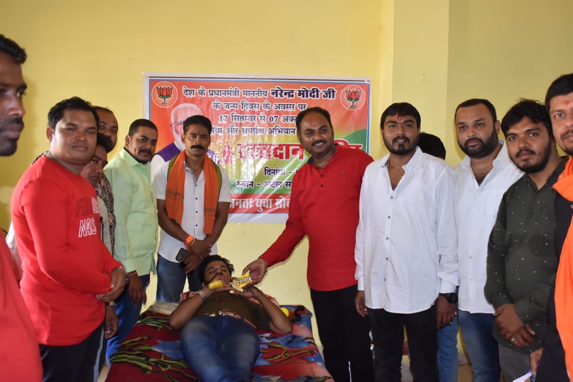 कोरबा:- प्रदेश नेतृत्व के आह्वान एवं जिला भाजपा के मार्गदर्शन में प्रधानमंत्री नरेंद्र मोदी जी के जन्मदिवस को सेवा और समर्पण कार्यक्रम के रूप में मनाते हुए विभिन्न आयोजन एवं सेवा कार्य कर रही है। इसी कड़ी में भाजयूमो जिला कोरबा द्वारा बरपाली मंडल में रक्तदान शिविर आयोजित किया गया,जहां लगभग 40 युवा कार्यकर्ताओं ने रक्तदान किया। इस अवसर पर प्रमुख रूप से रायगढ़ जिला संगठन सह प्रभारी एवं प्रदेश कार्यसमिति सदस्य विकास रंजन महतो,जिला भाजपा महामंत्री संतोष देवांगन,महामंत्री टिकेश्वर राठिया,प्रदेश सदस्य सहकारिता किशन अग्रवाल,भाजयूमो जिलाध्यक्ष पंकज सोनी,भाजपा मंडल अध्यक्ष प्रदीप पटेल, महामंत्री अनूप यादव, उपाध्यक्ष रंजू यादव, मंत्री नरेंद्र बिंझवार,पीयूष गुरुद्वान,सह कोषाध्यक्ष बृजेश यादव, सोसल मीडिया संयोजक अरविंद पटेल,भाजयूमो मंडल अध्यक्ष रवि साहू,प्रवीण उपाध्याय, दिनेश तिवारी,रामावतार पटेल,राजकुमार पटेल,अमरनाथ पटेल,हितेश अग्रवाल,संतोष राठौर,महामंत्री भाजयूमो मंडल बरपाली संजू वैष्णव,विकास अग्रवाल,दीपक देवांगन, नवीन देवांगन,नरेंद्र कुमार,विद्द्या सागर, विकास अग्रवाल, लोकेश यादव, वेद प्रकाश, रामगोपाल, दीपेश कुंभकार आदि प्रमुख रूप से उपस्थित थे।