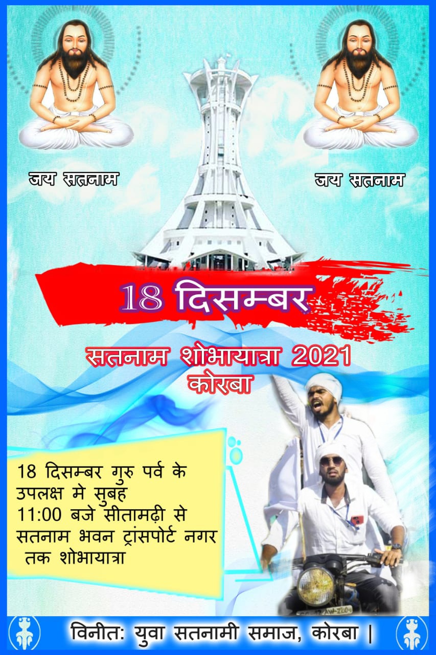 18 दिसंबर परम पूज्य बाबा गुरु घासीदास जी के जयंती के अवसर पर युवा सतनाम समिति कोरबा द्वारा भव्य शोभा यात्रा सीतामढ़ी से सतनाम भवन ट्रांसपोर्ट नगर तक आयोजन किया जा रहा है जिसका नेतृत्व लक्ष्य चतुर्वेदी ,सत्येंद्र डेहरिया ,विनोद डेहरिया , मनोद मनहर,शब्बीर जांगड़े, रिंकू आदिले , विजय आदिले , संदीप खांडेकर , प्रदीप अनंत , एवं समस्त युवा टीम सतनामी कल्याण समिति के समस्त पदाधिकारी सदस्यगण साथ ही समाज के सभी वर्ग के नेतृत्व में शोभायात्रा निकाली जाएगी